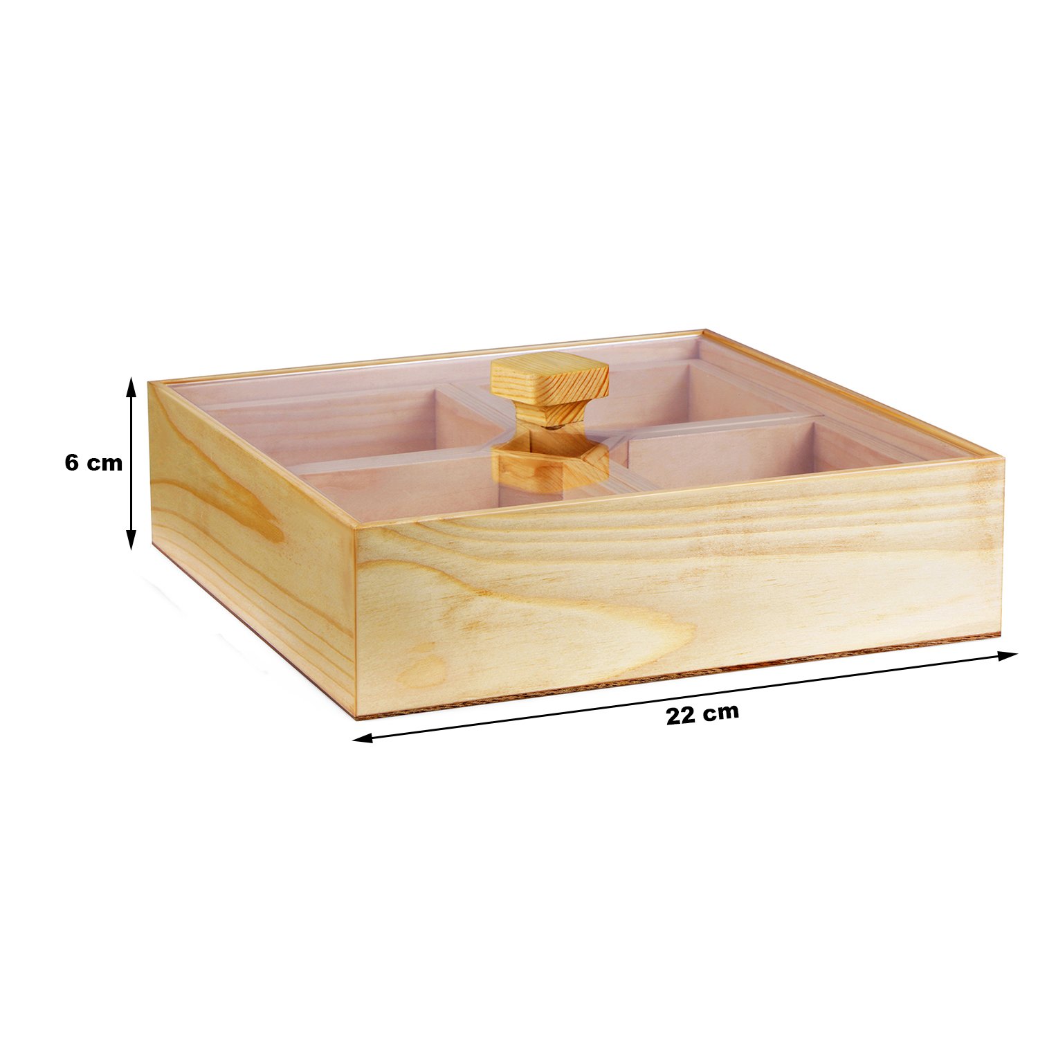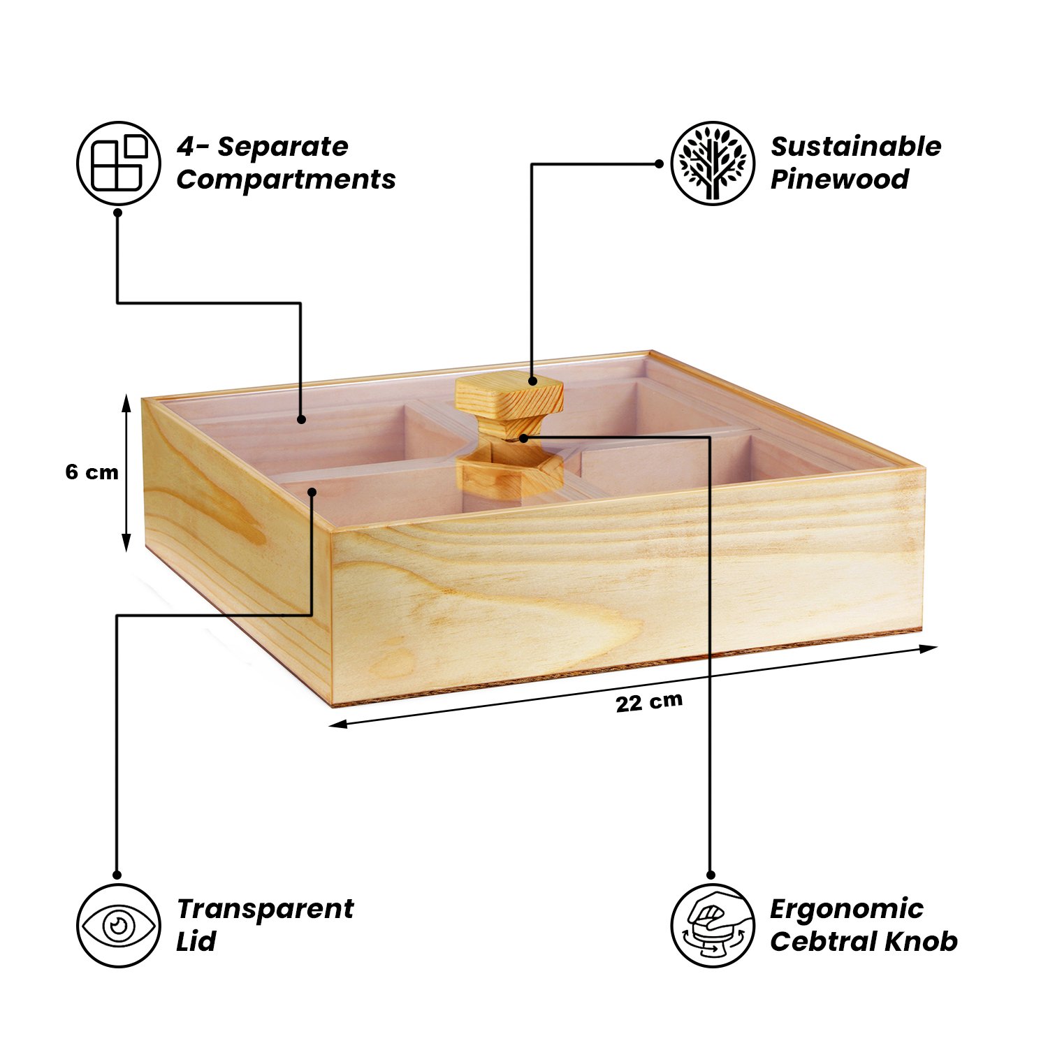 Present your snacks and gifts in a stylish and organized way with this beautifully designed Wooden Box with 4 Individual Compartments, crafted from high-quality pinewood and MDF for a smooth, durable, and long-lasting finish. This premium wooden storage box is designed for both serving and gifting purposes, making it a perfect addition to your home or festive collection.