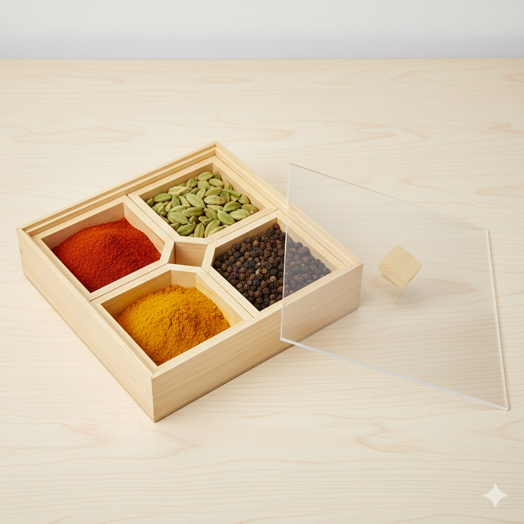 The box features four separate compartments with removable trays, allowing you to easily serve dry fruits, sweets, chocolates, snacks, or spices without mixing them. Each section comes with a clear glass lid, making it easy to view the contents while keeping them protected from dust and moisture.